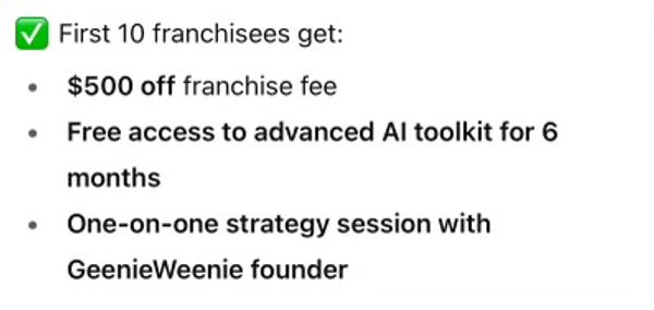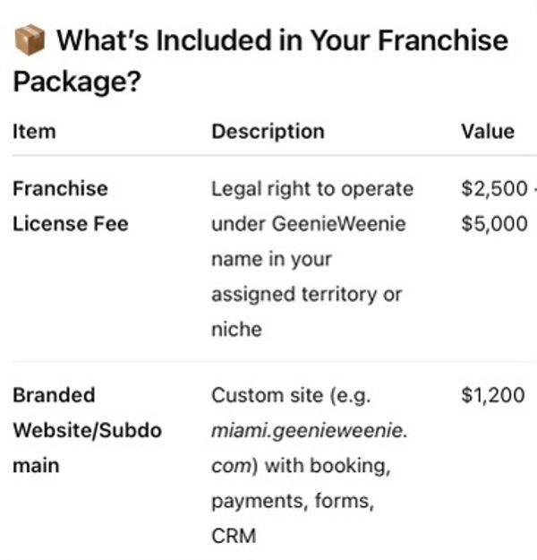 $4,995-$9,995 (depending on territory size and niche exclusivity), Geenie Weenie is the perfect and most affordable franchise to own.